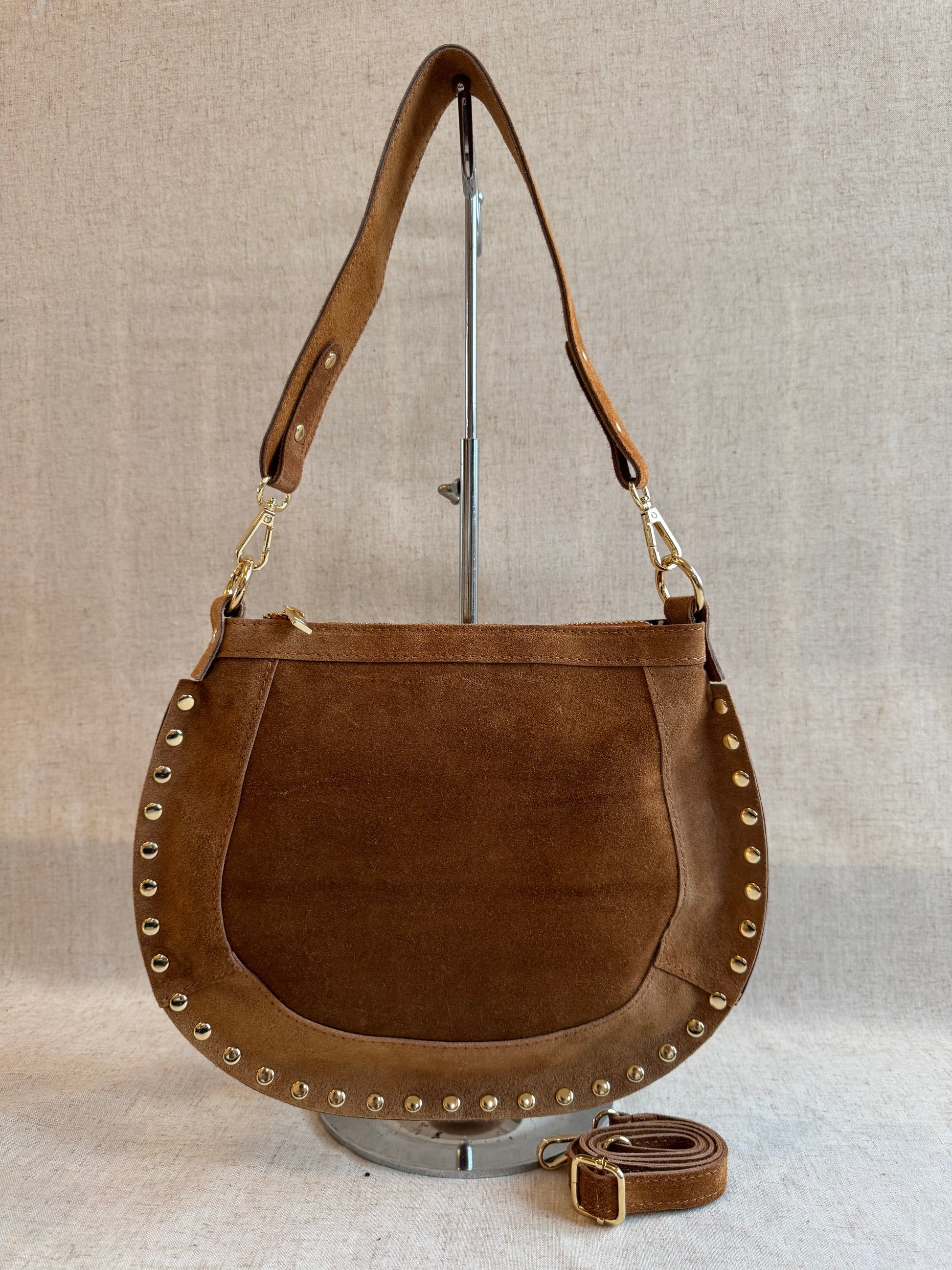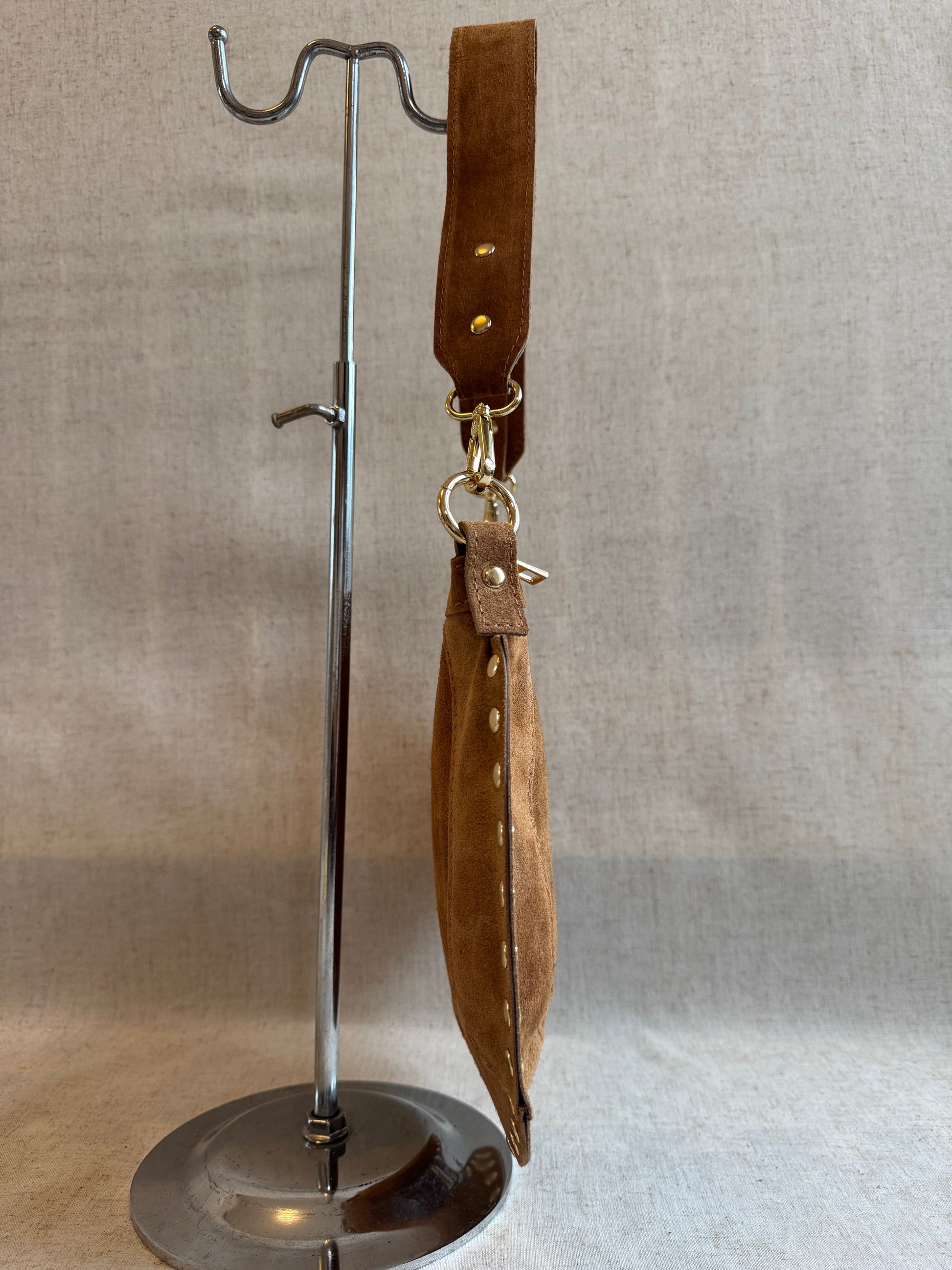 Borsa a spalla con tracolla lunga regolabile compresa. Realizzata a mano in vera pelle scamosciata.