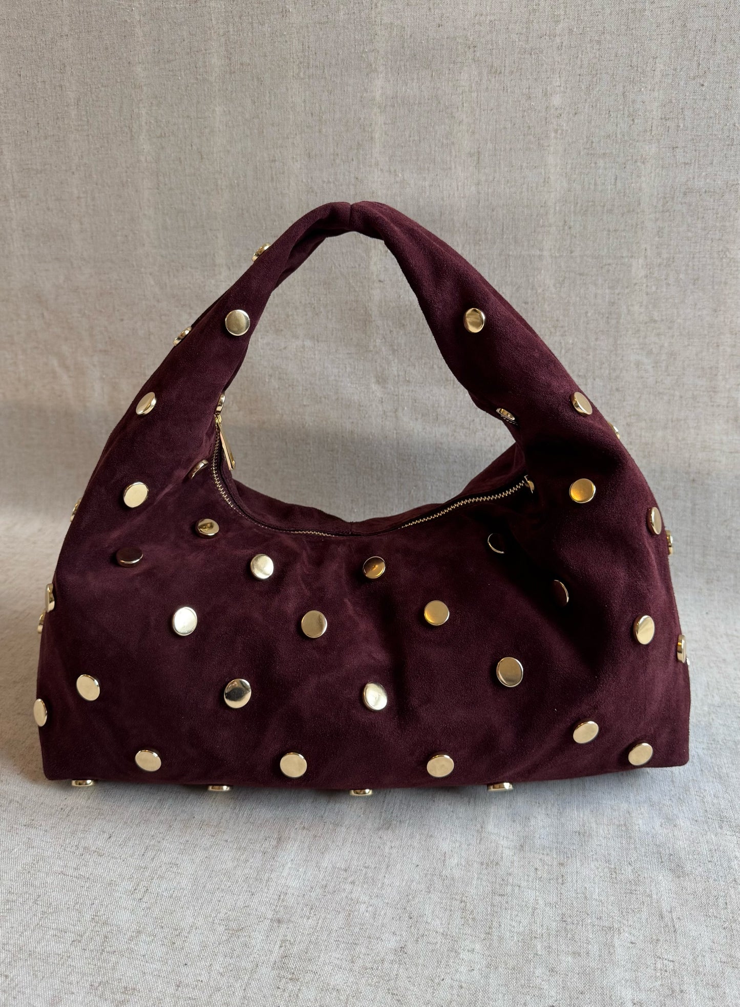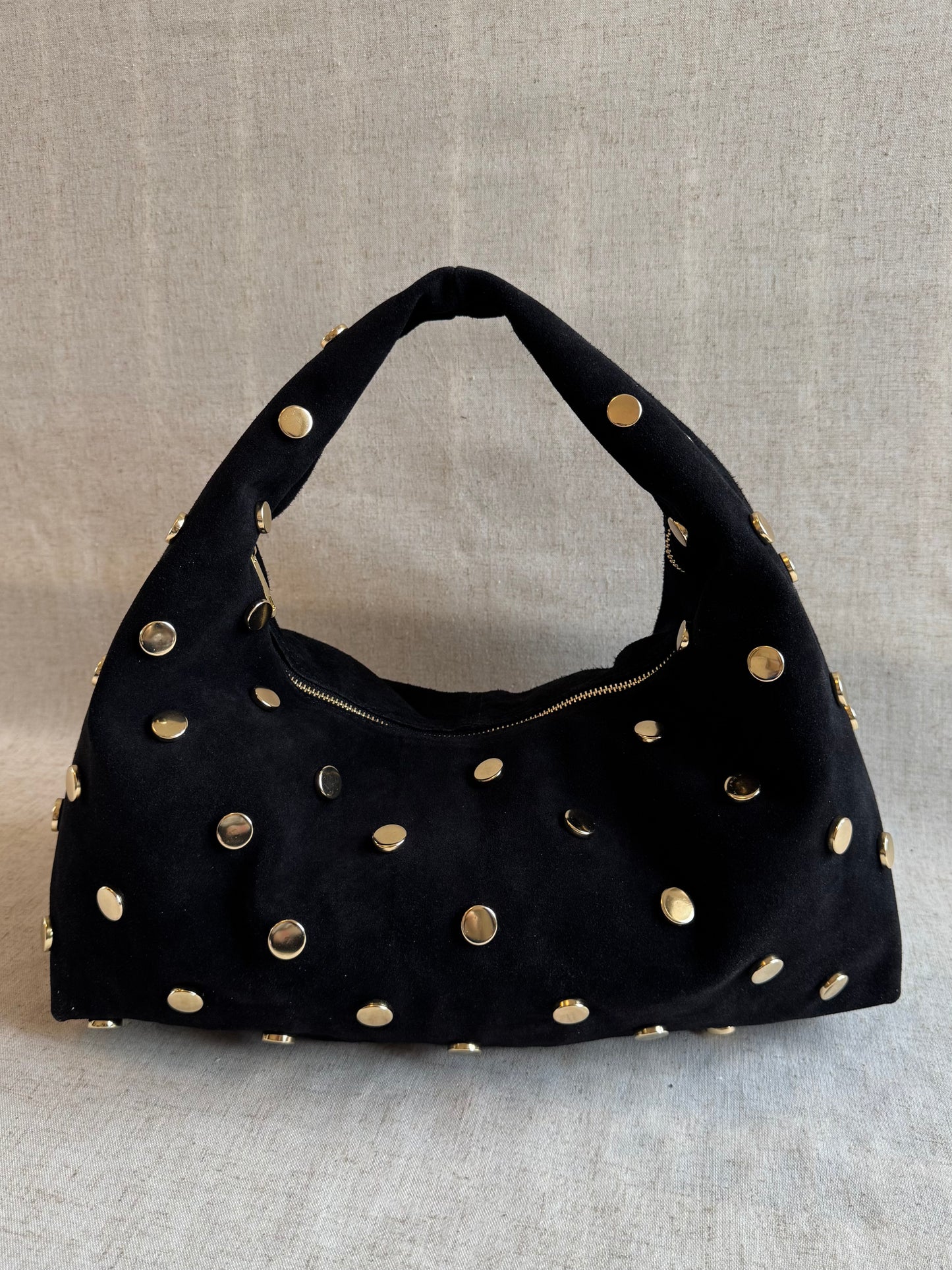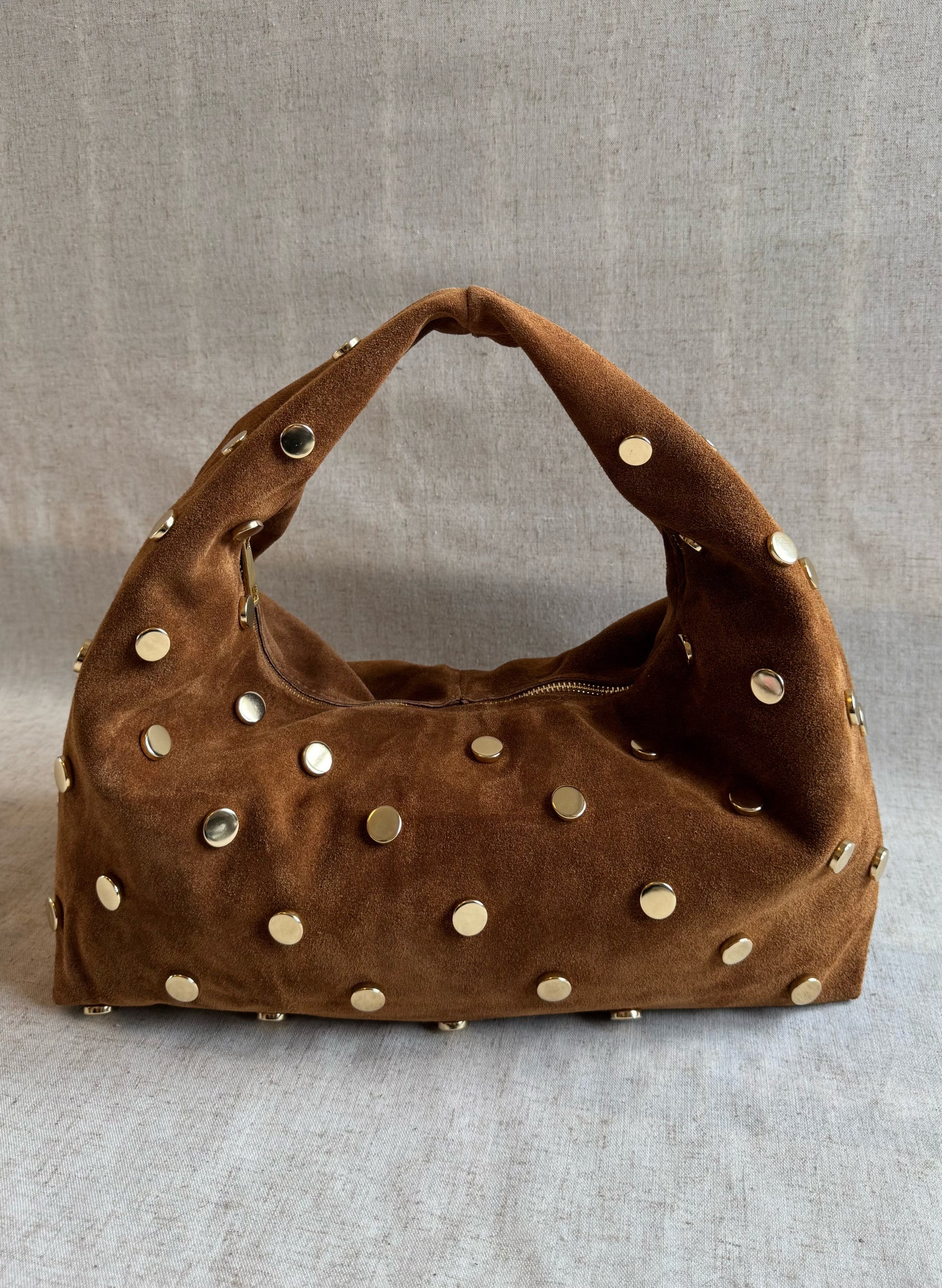 Realizzata a mano in vera pelle scamosciata, dettaglio borchie frontale