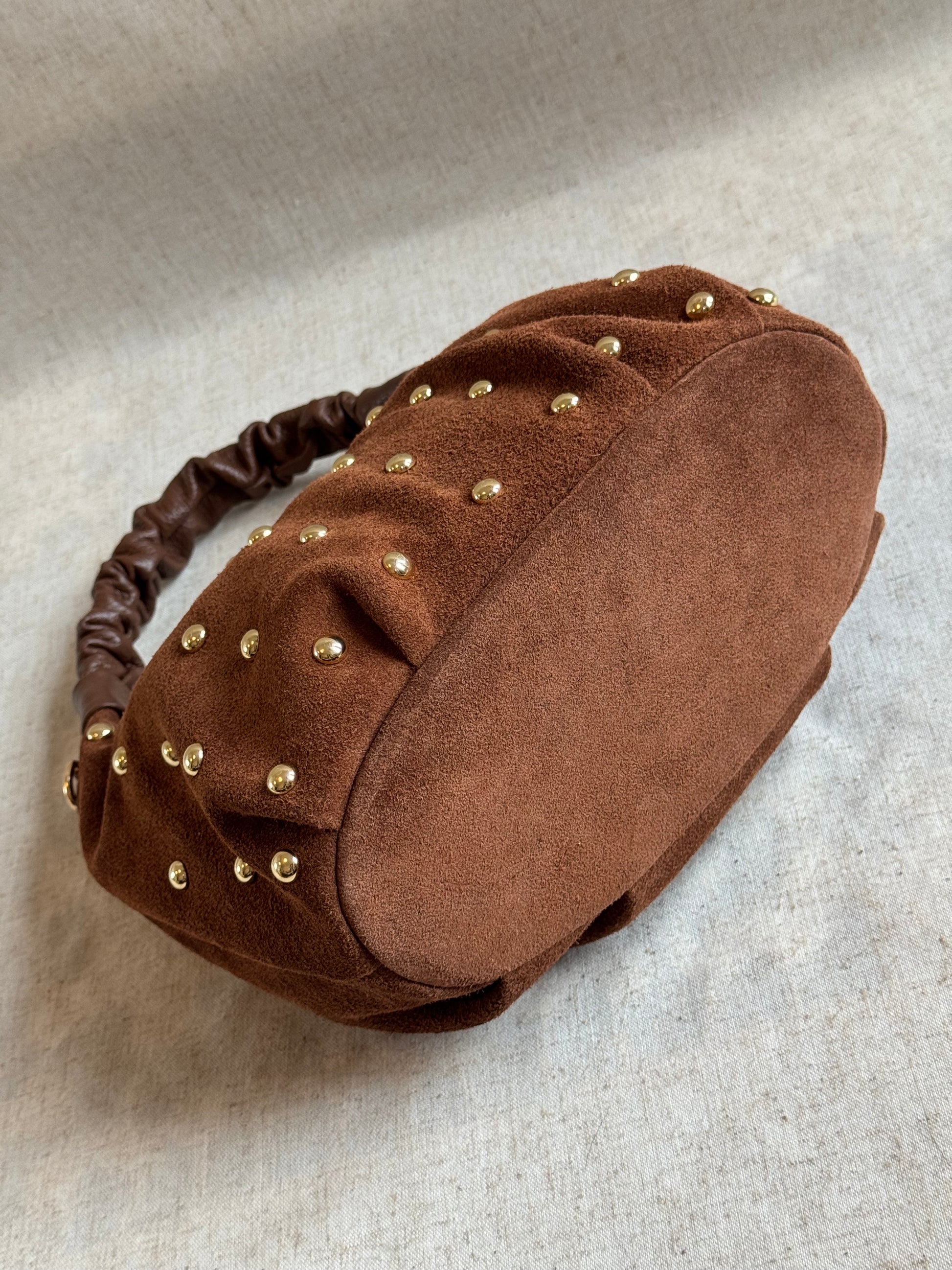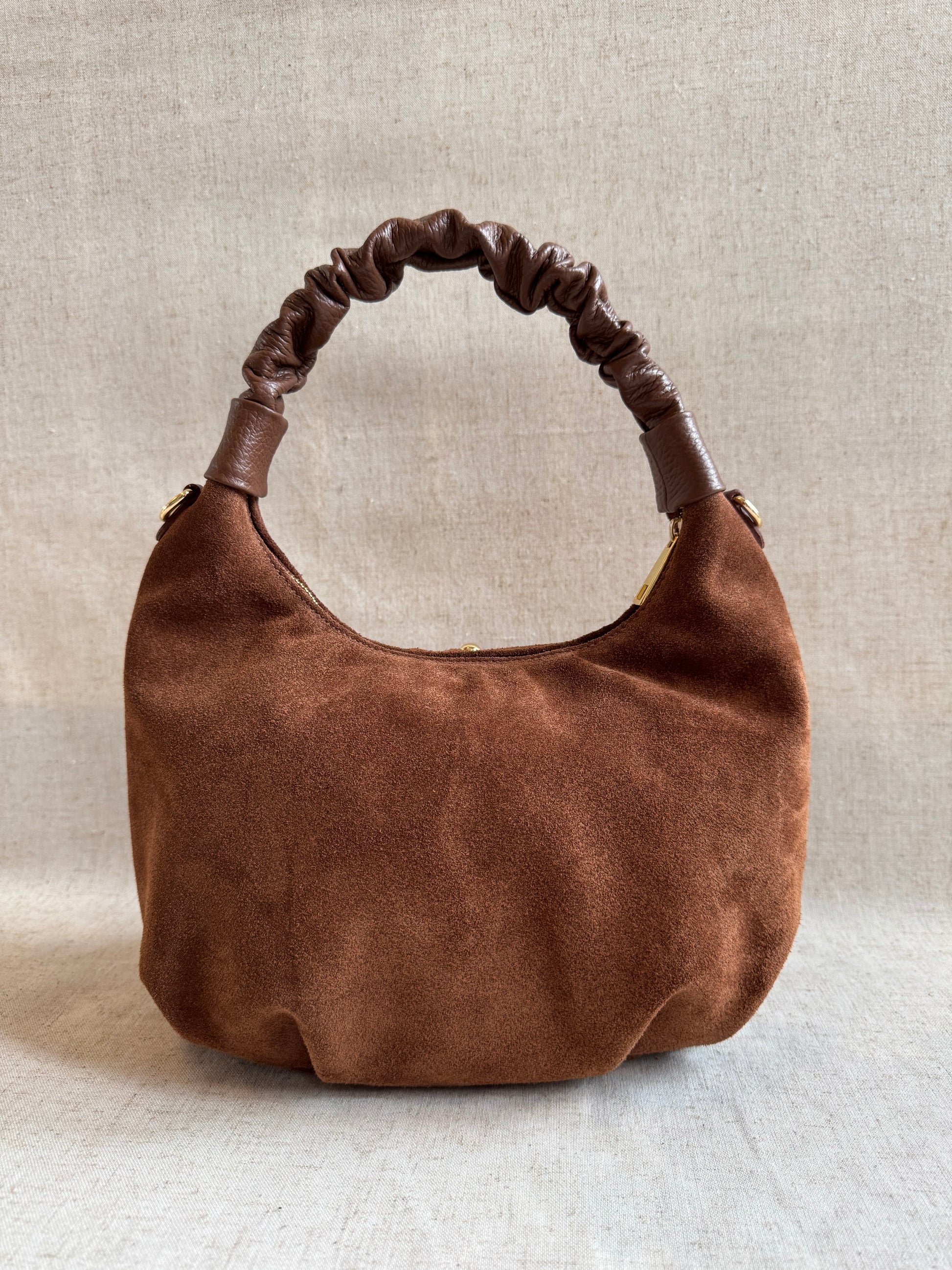 Borsa a spalla con tracolla lunga regolabile compresa. Realizzata a mano in vera pelle scamosciata.