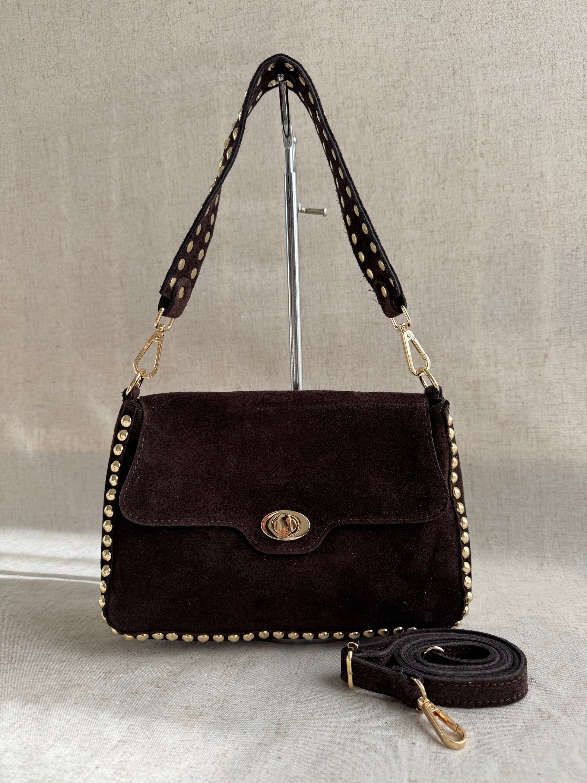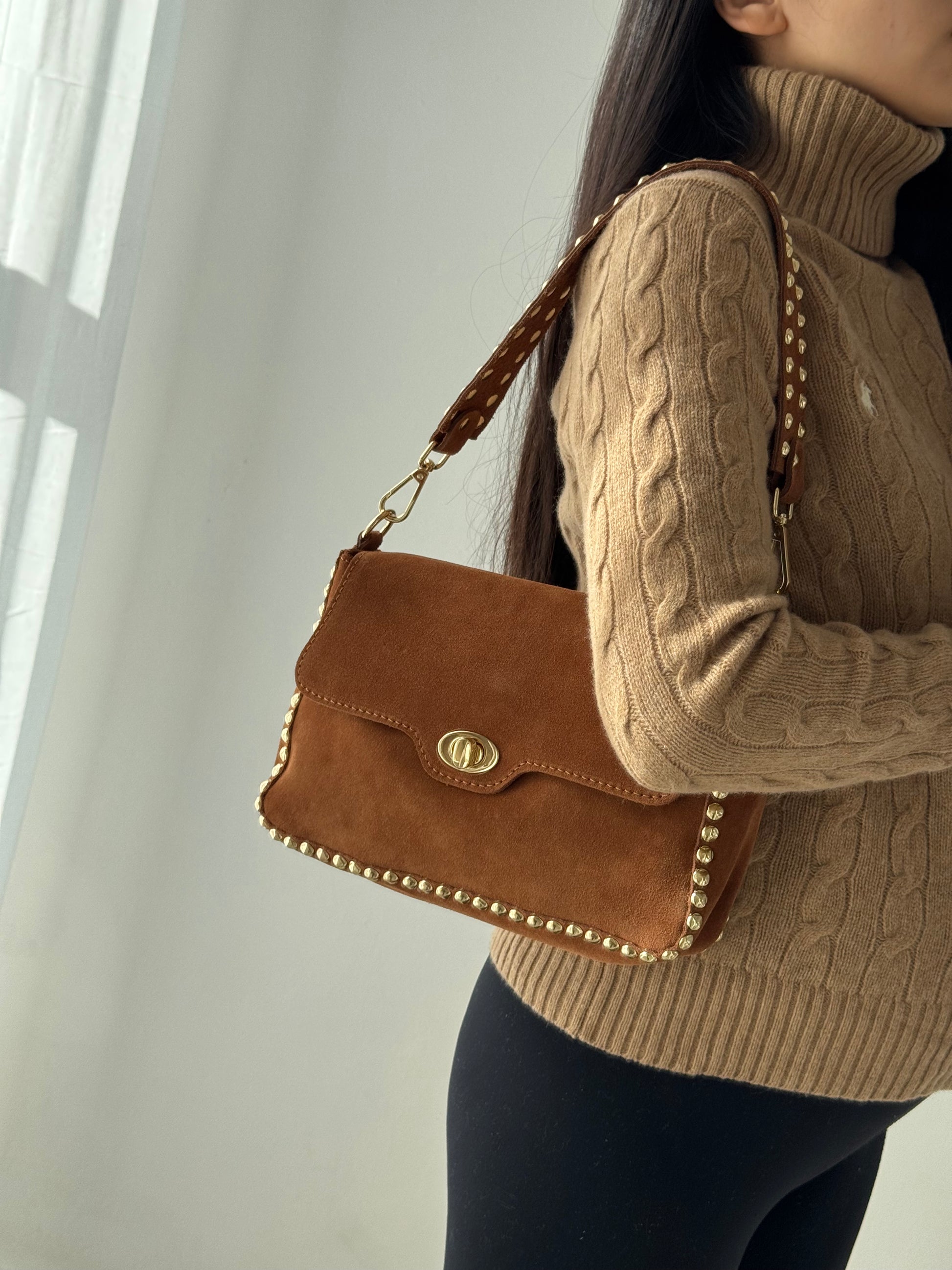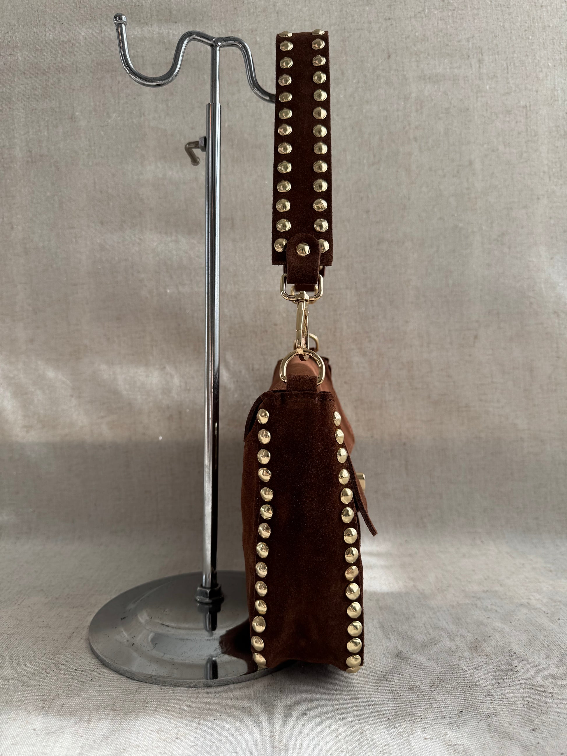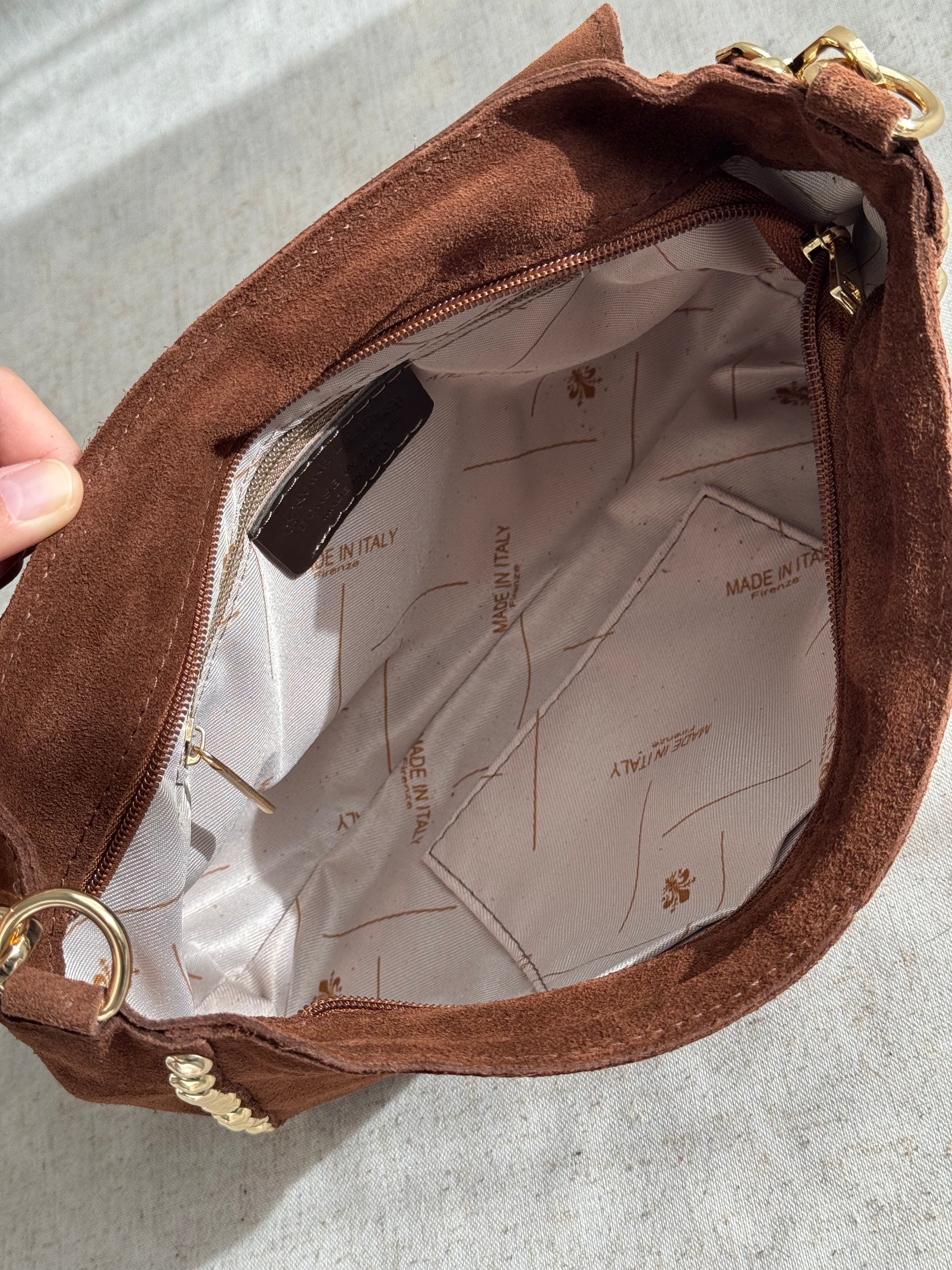 Realizzata a mano in vera pelle scamosciata.