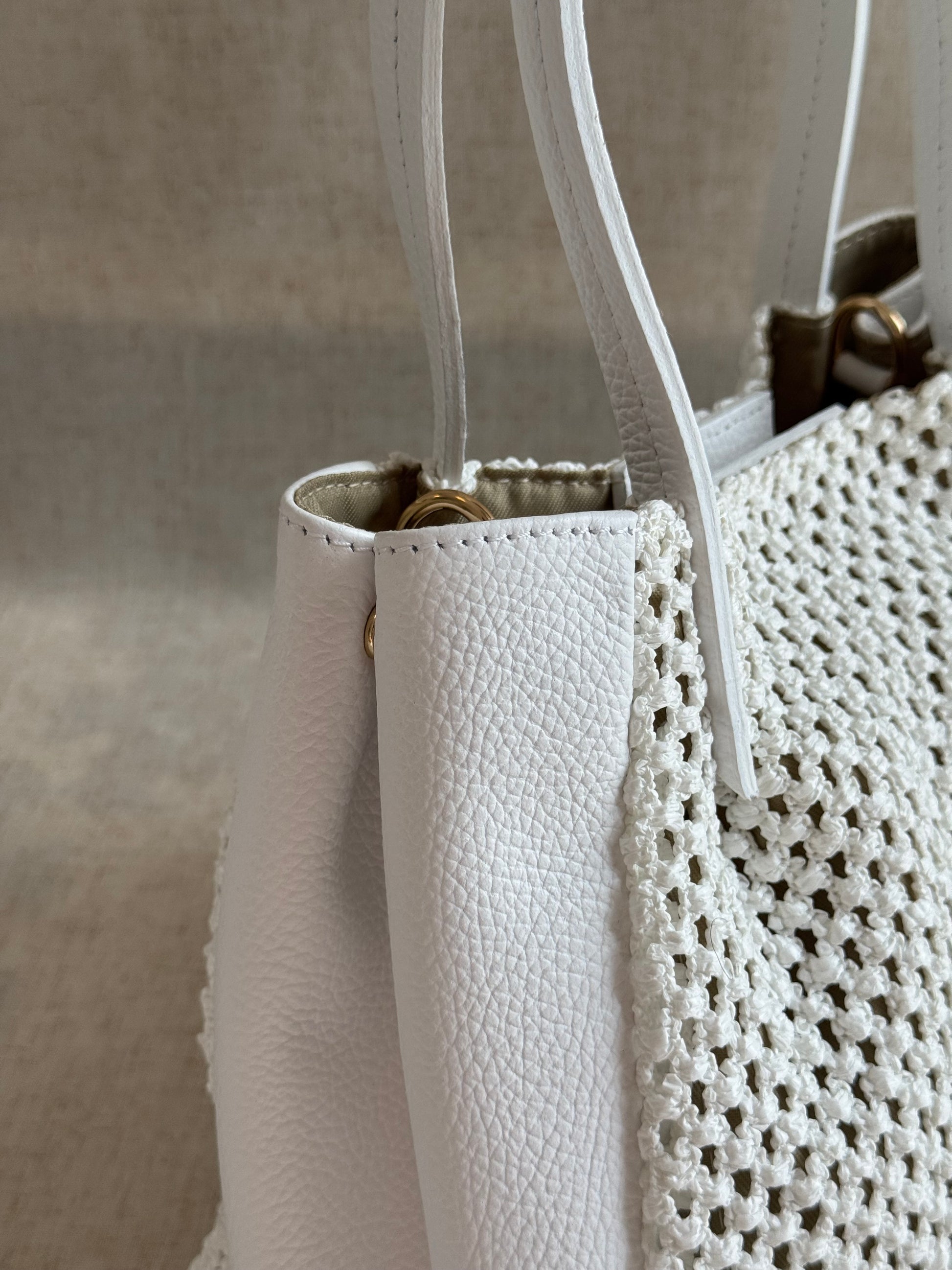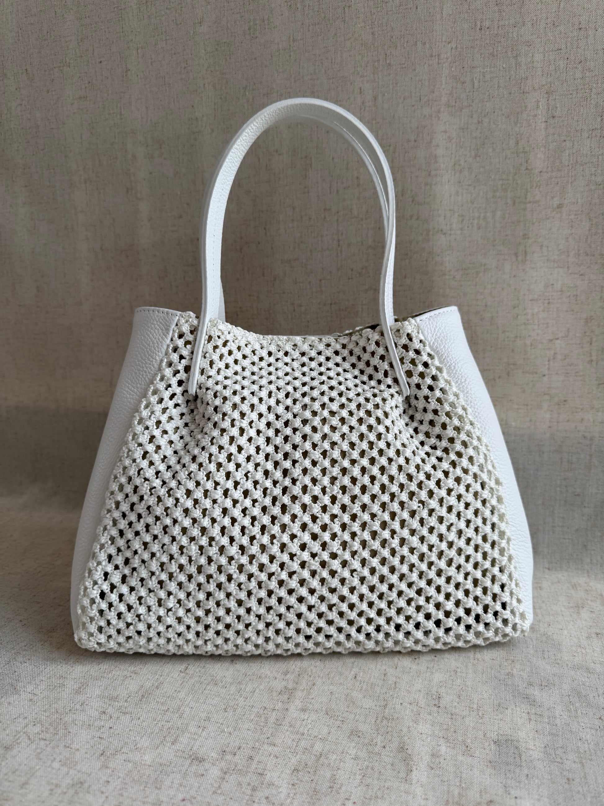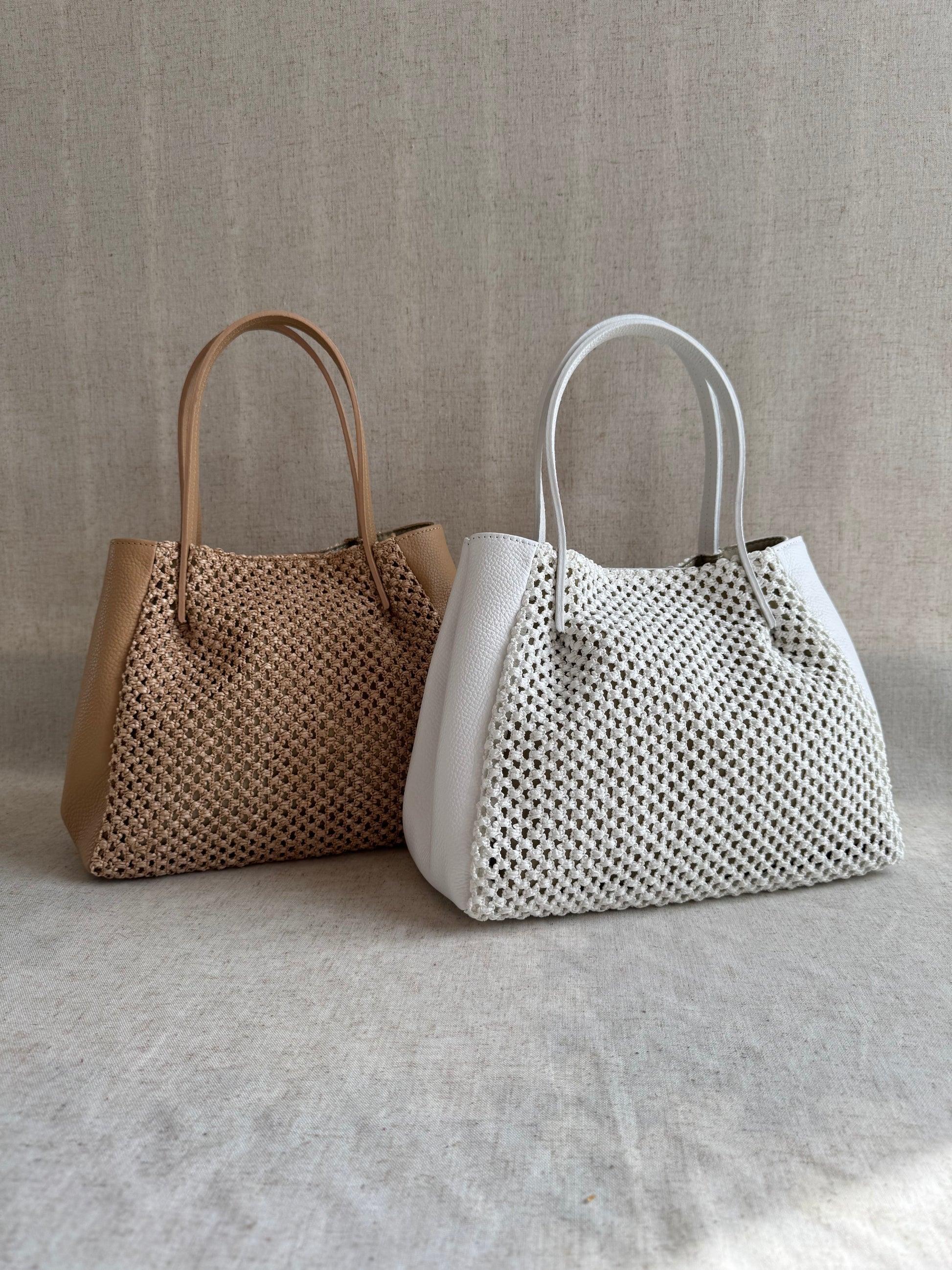 Realizzata in vera pelle e rafia naturale, Made in Italy.