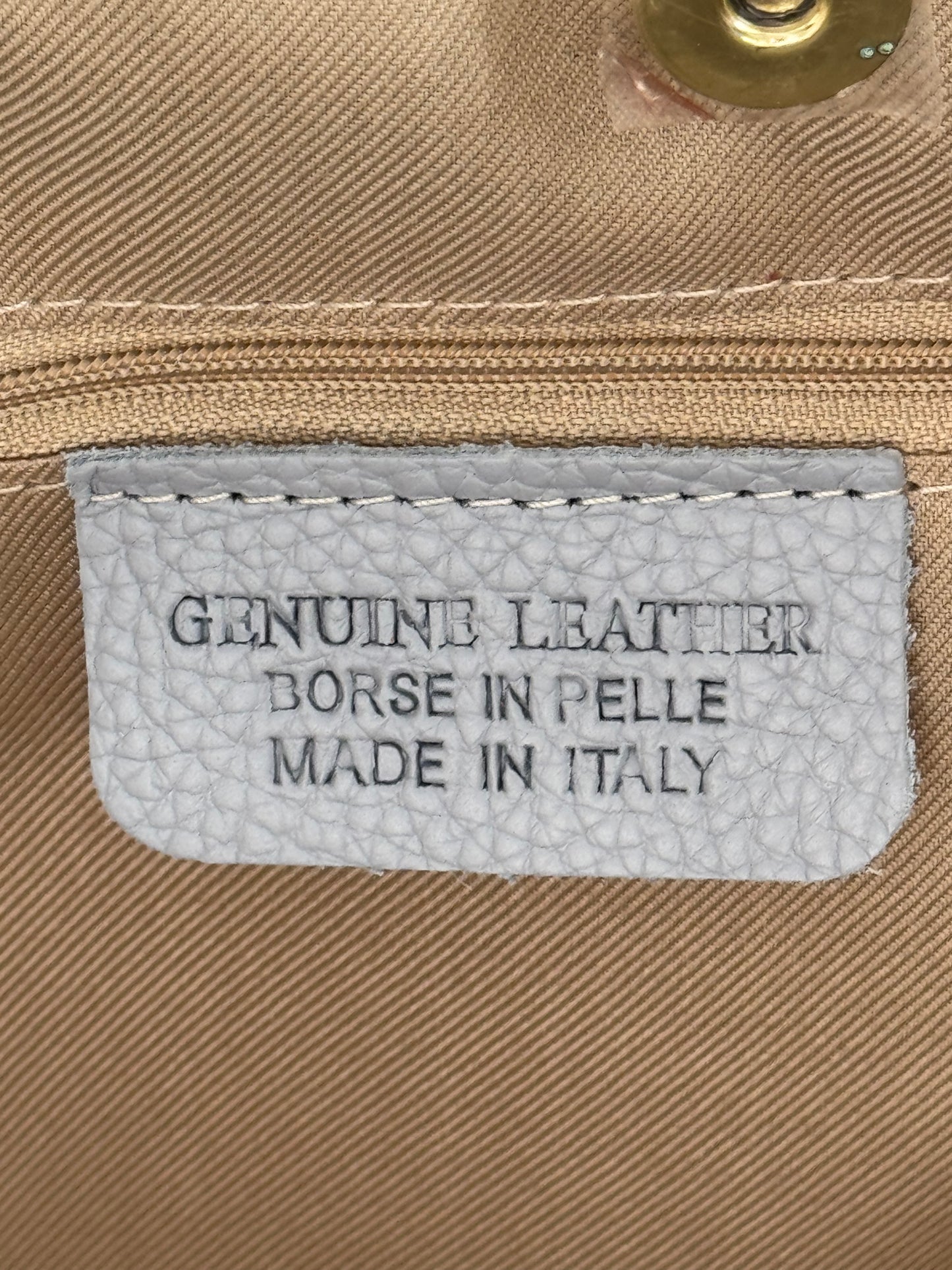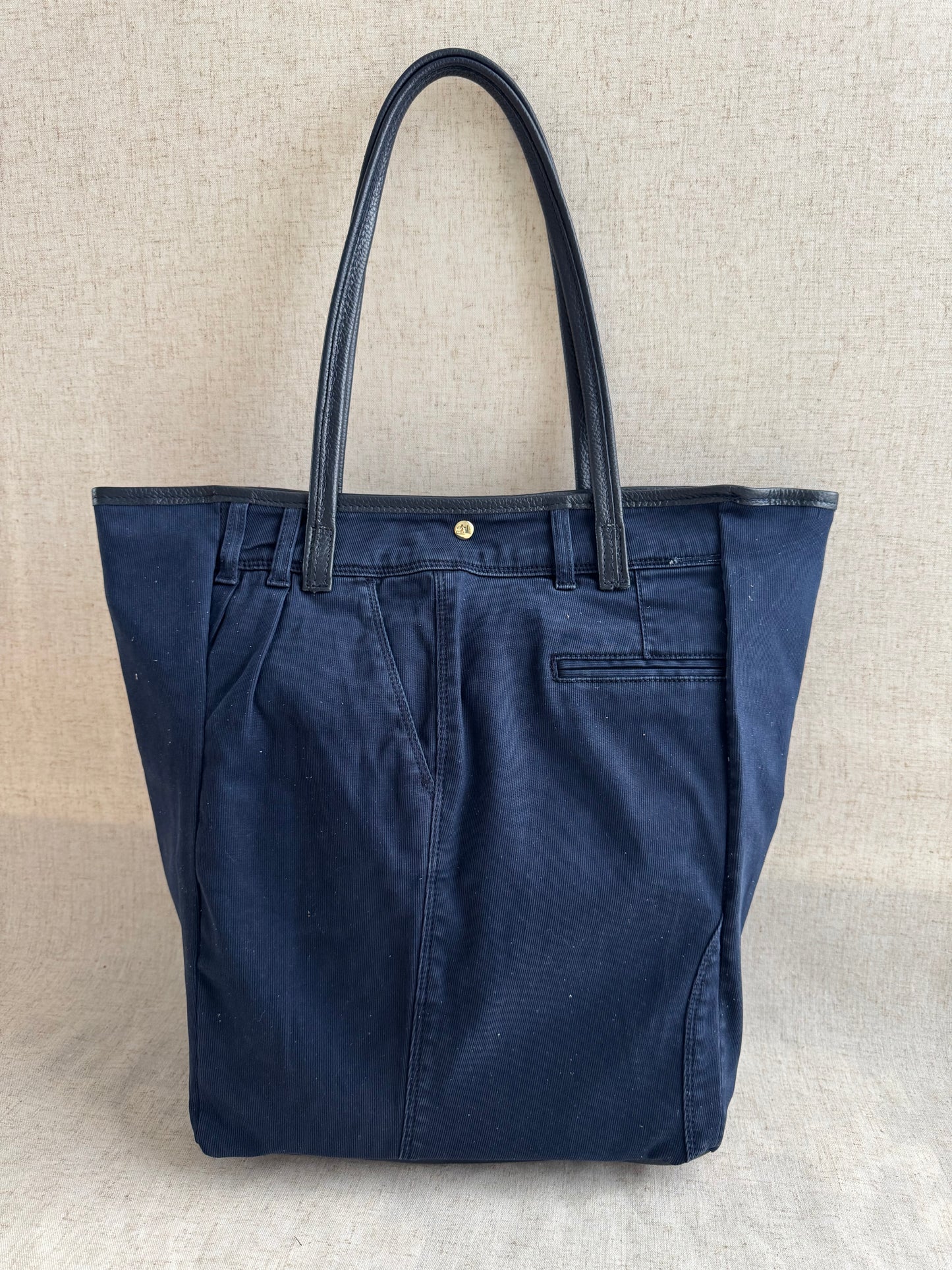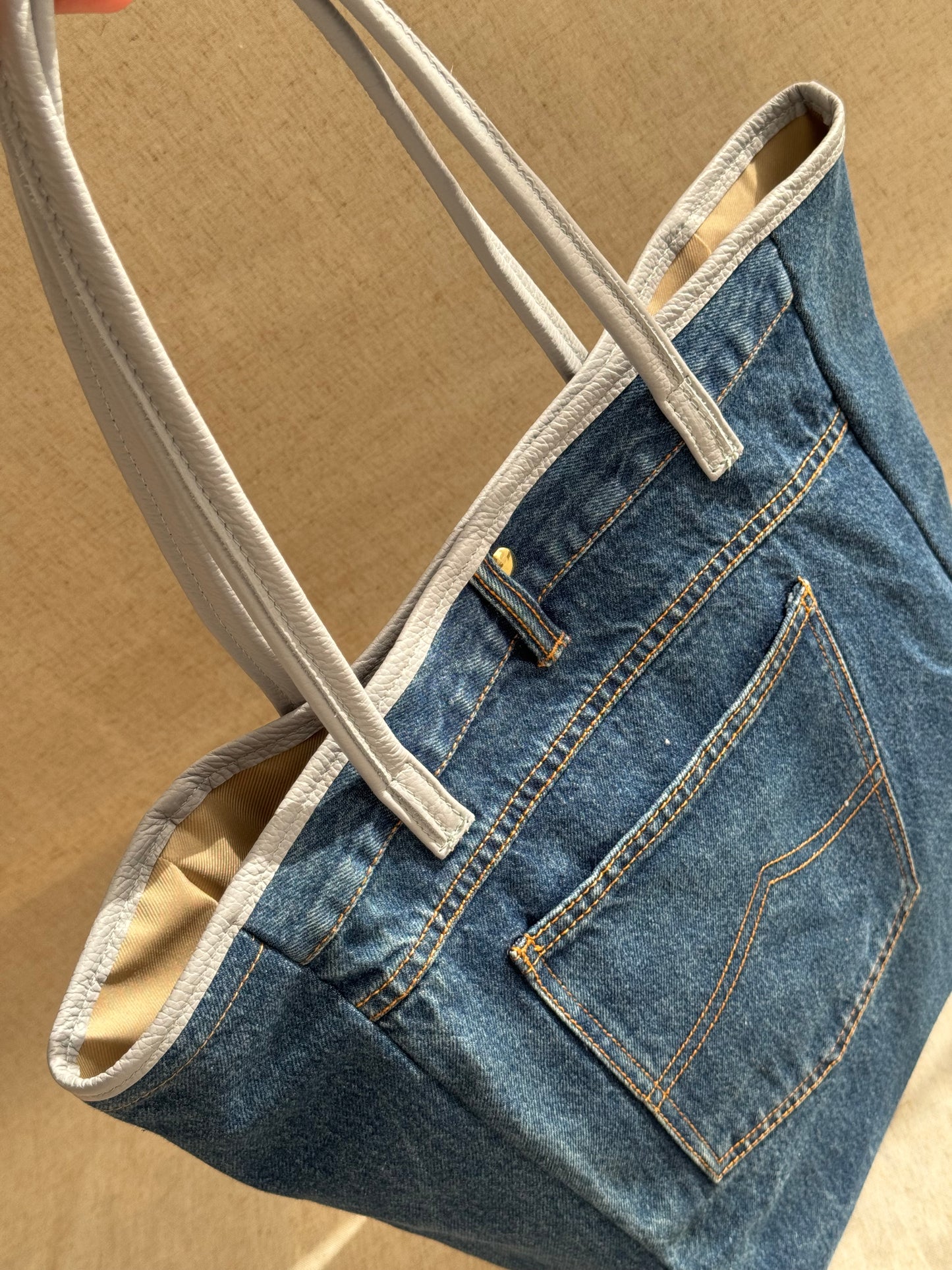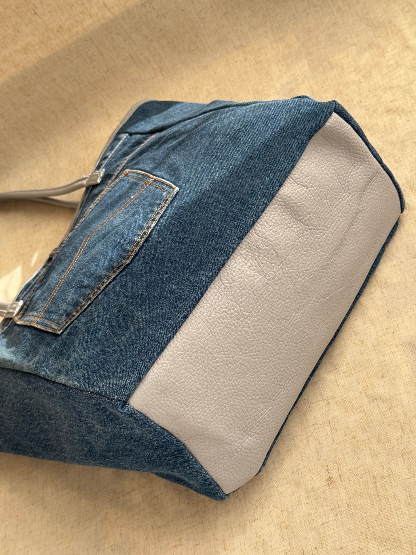 Realizzata in vera pelle e jeans, made in Italy.
