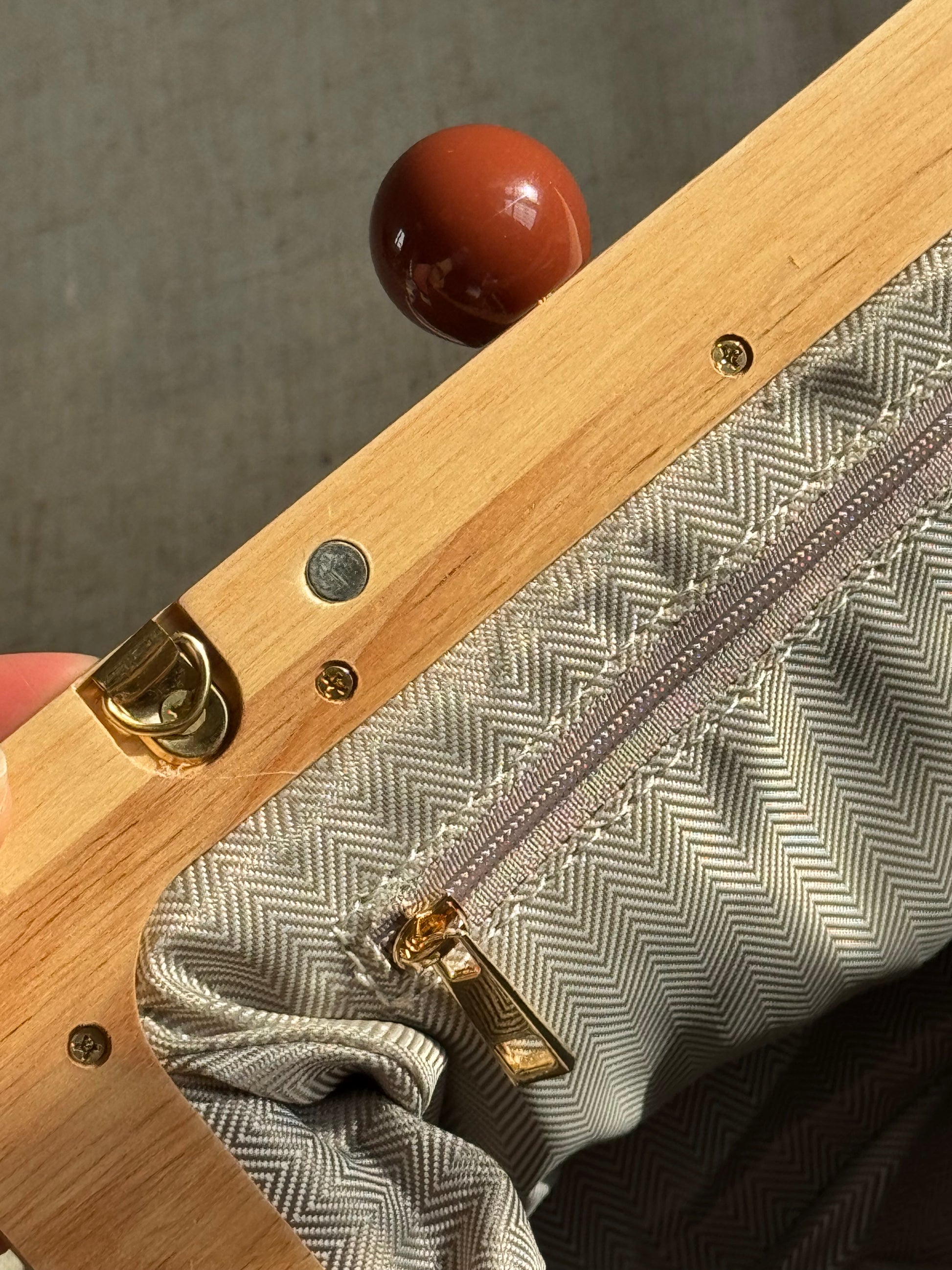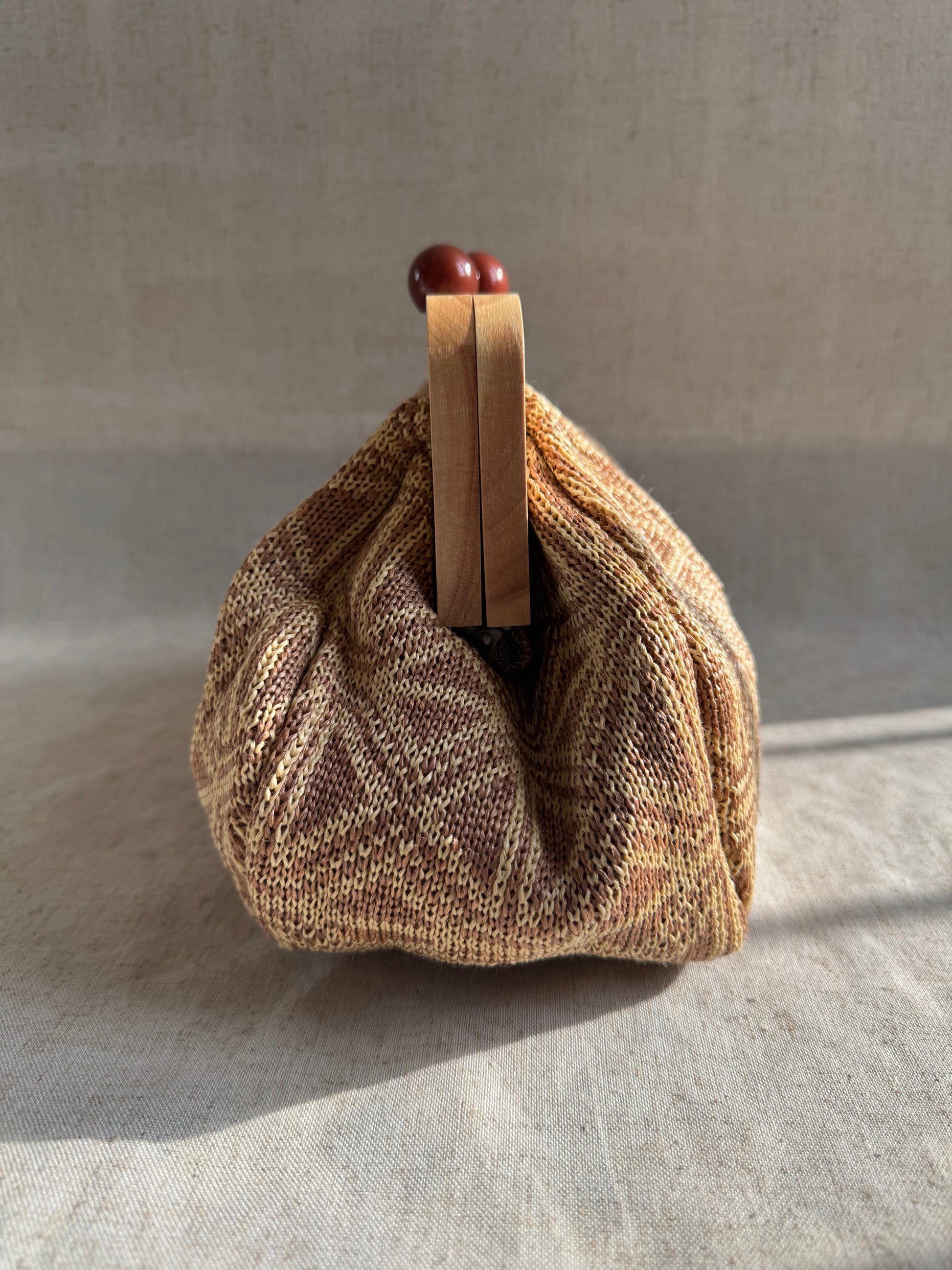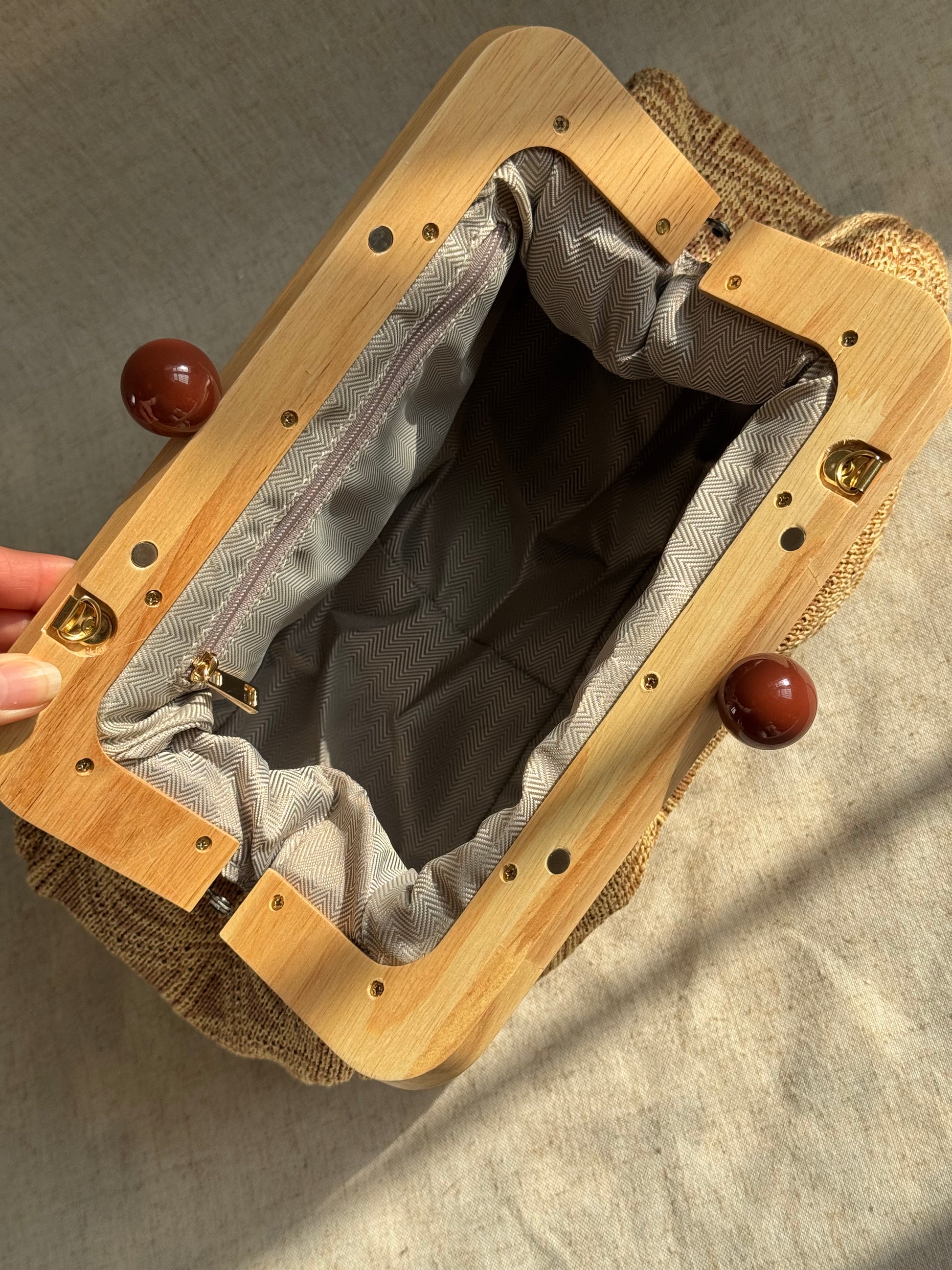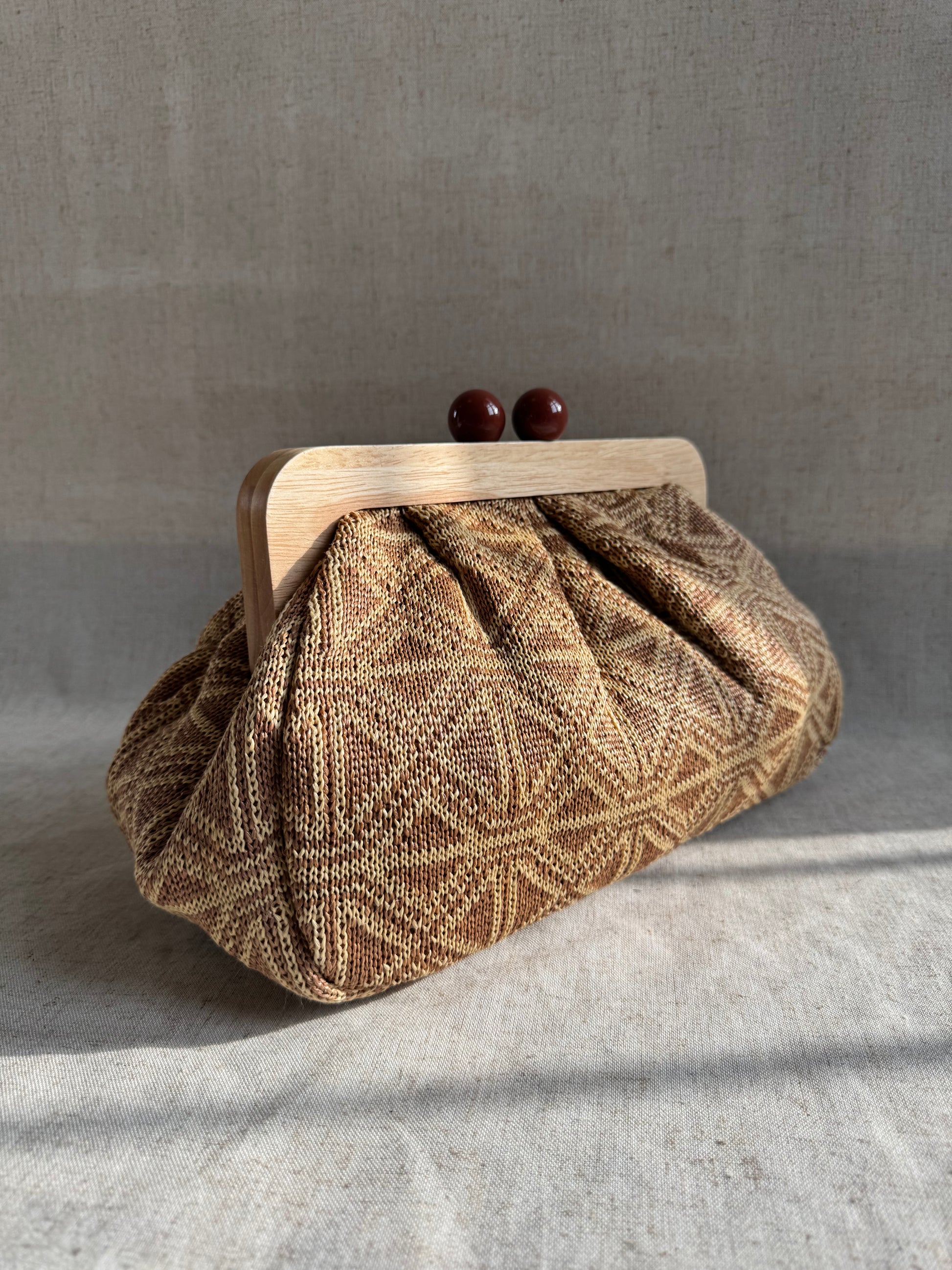 Realizzata in tessuto e legno naturale.