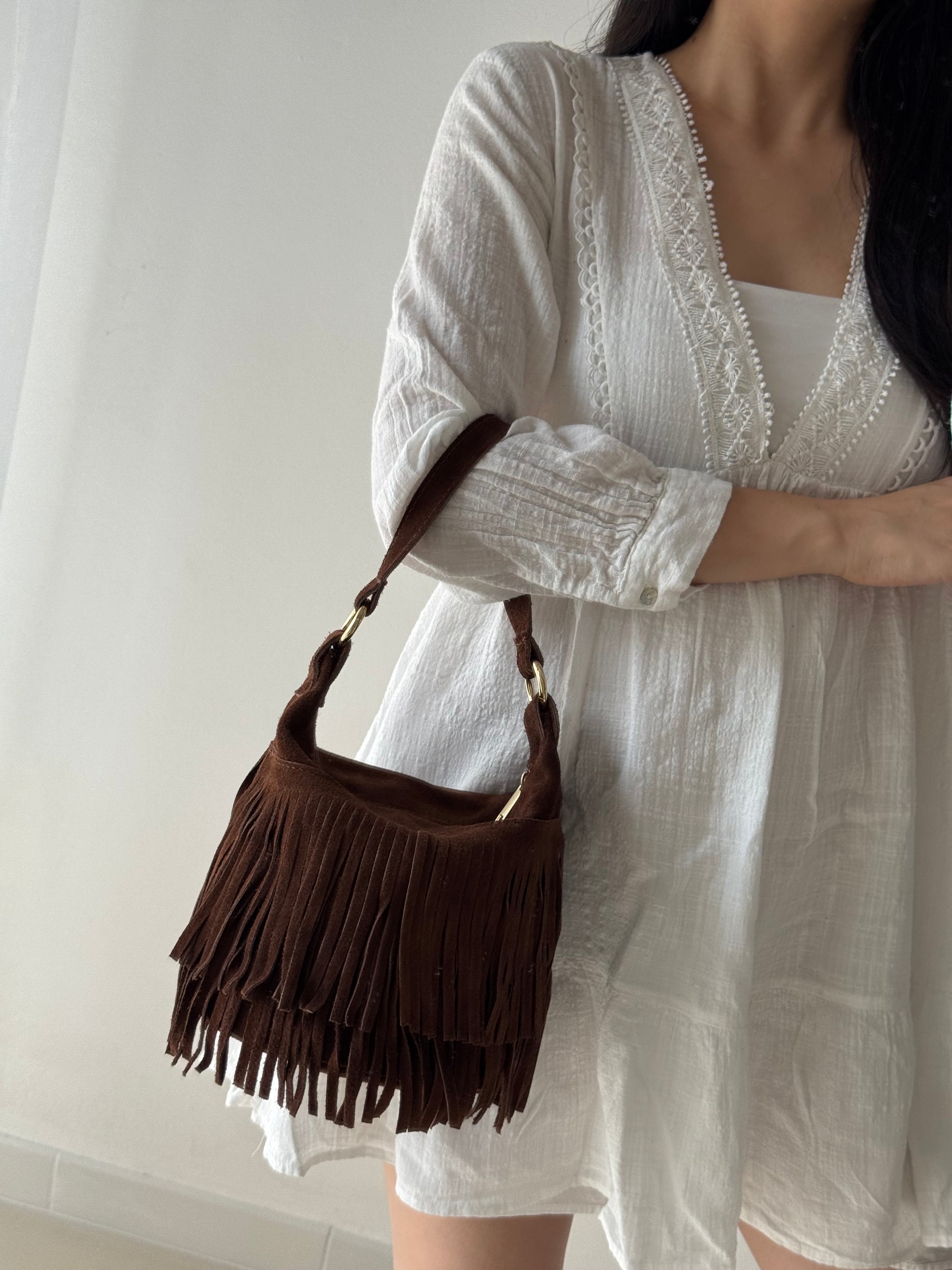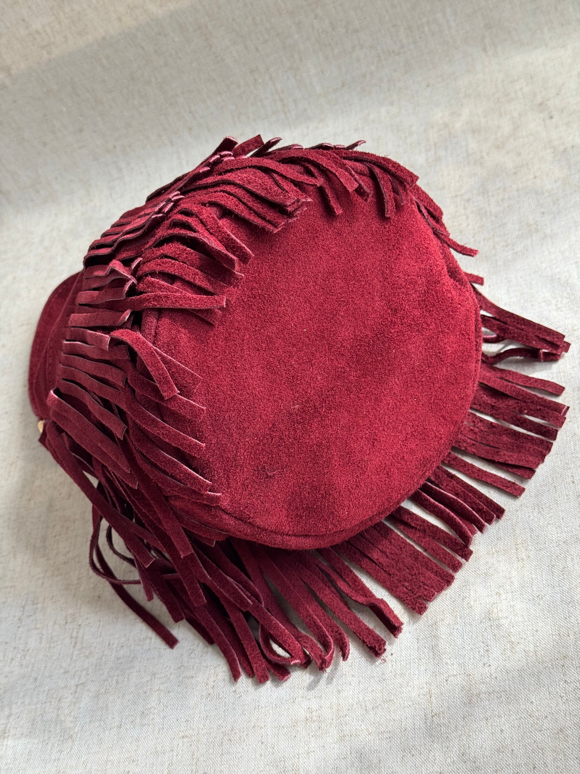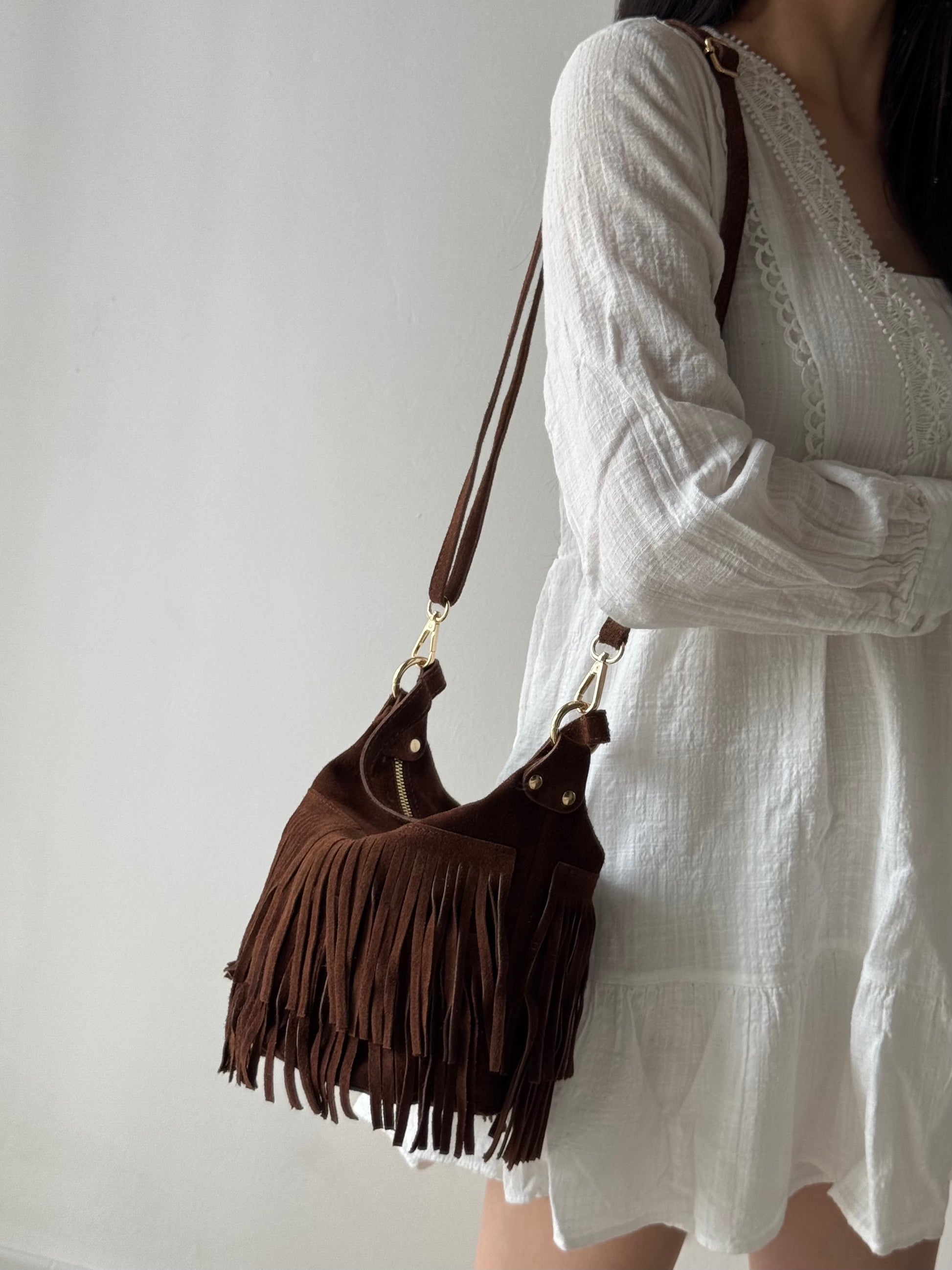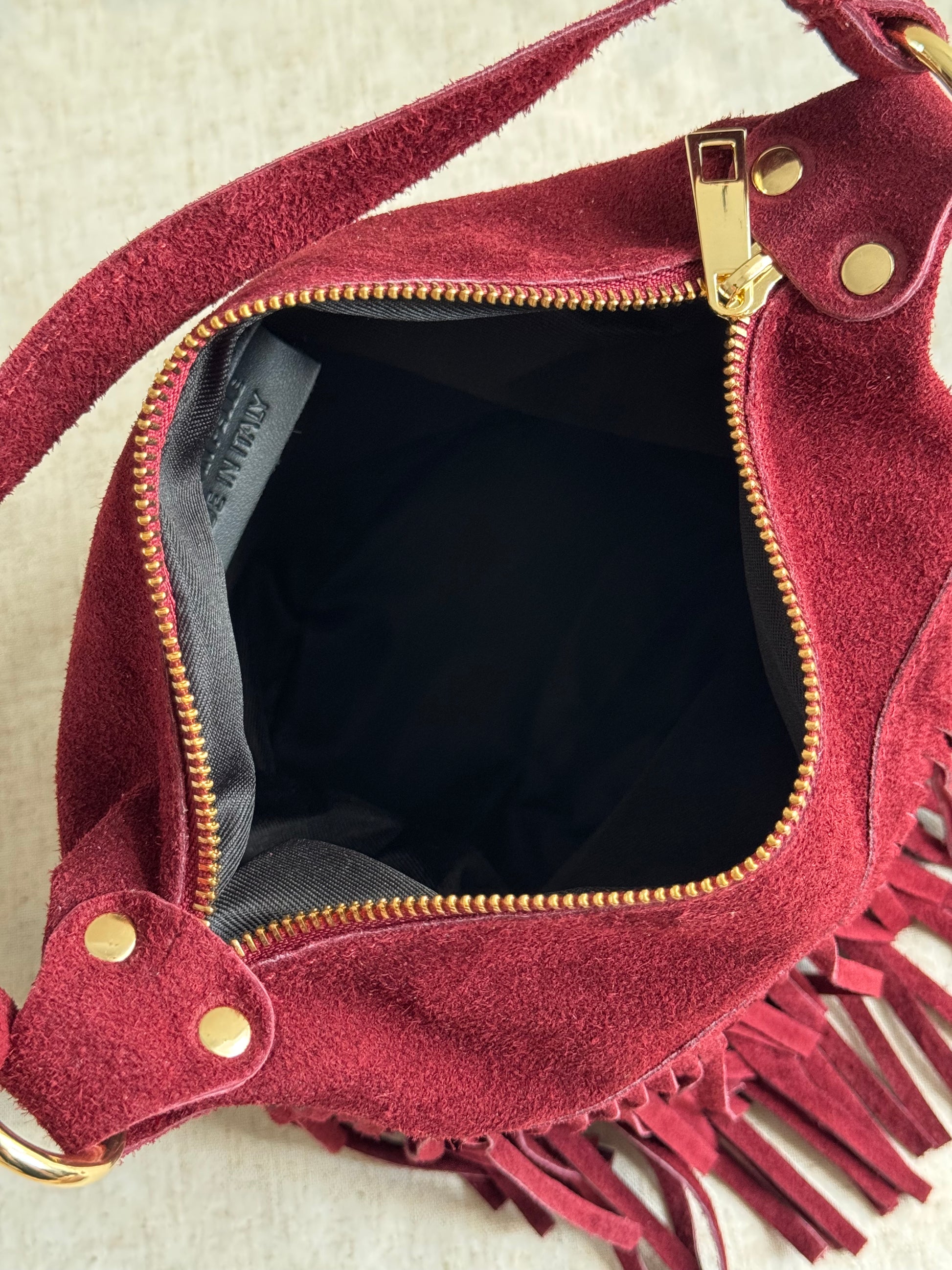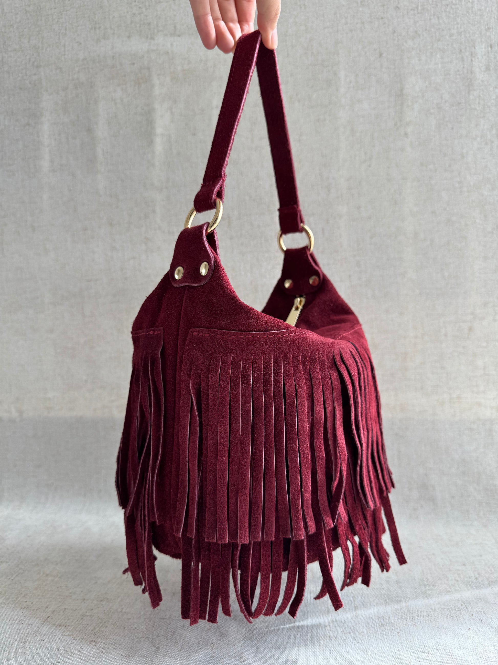 Realizzata a mano in vera pelle scamosciata, Made in Italy.
